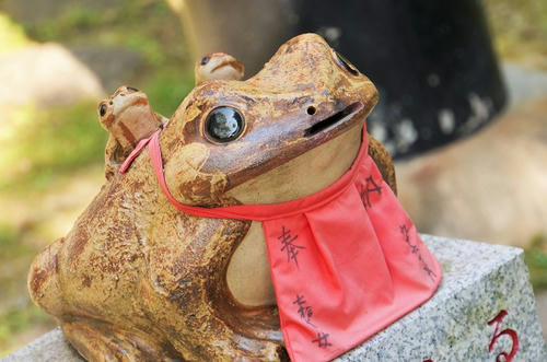 かわいらしい子かえるを2匹背負った狛犬ならぬ狛蛙がいます。