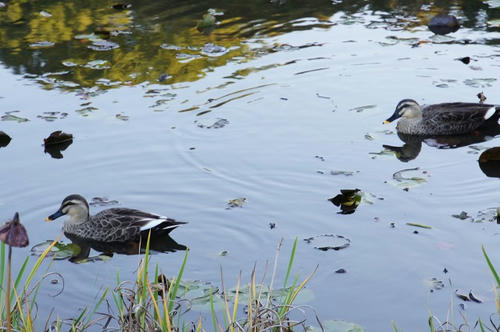 カルガモさんたち、ご機嫌で泳いでらっしゃいます。この2匹は仲良しなのか、ずっと一緒に泳いでました。