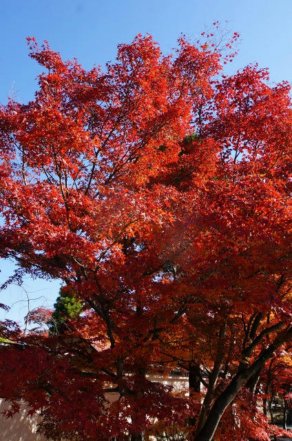 燃えるような赤とよく晴れた空の青のコントラストが良いですね。
