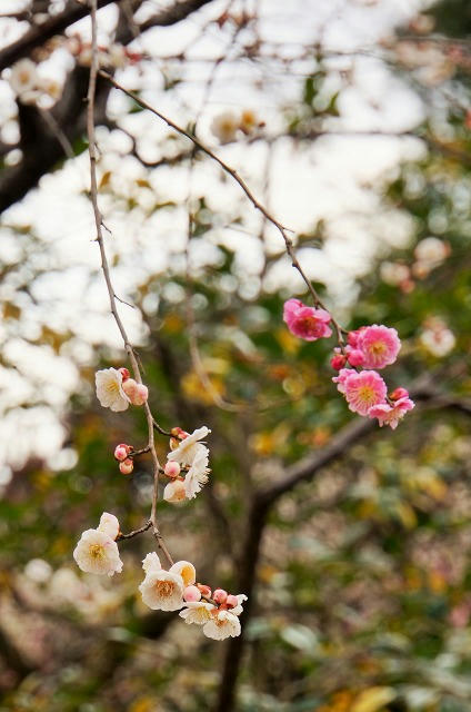 同じ枝から白い梅とピンクの梅が。なんだかお得な感じ?