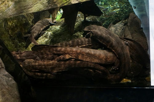 入ってすぐのところにある「京の川ゾーン」では、この水族館の人気者?のオオサンショウウオが入れ食い状態でお休みになられてました。