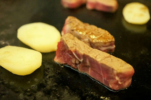 ここのお店はテーブルに溶岩プレートが設置されていて、自分の好きな枚数、好きな焼き加減で焼くことが出来ましたよ。