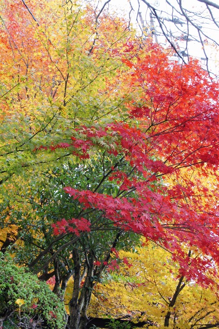 赤々として散りかけている紅葉も多いなか、まだ染まりかけのものもありましたよ。
