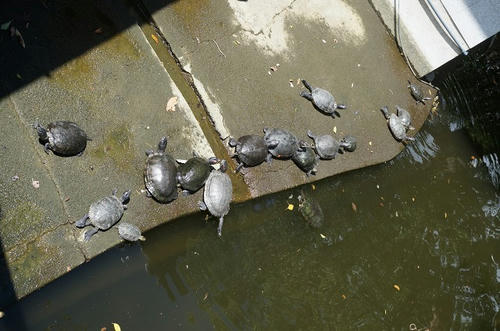 池のそばにはたくさんのカメが。