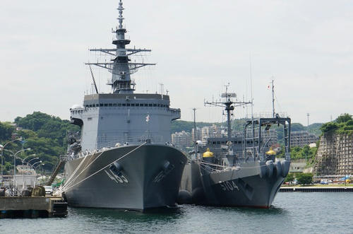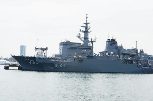 海洋観測艦わかさ(AGS-5104)と掃海母艦うらが(MST-463)が並んでますよ。