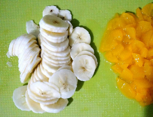 スムージーの粉だけじゃレシピっぽくないので、果物を入れてみましょう。