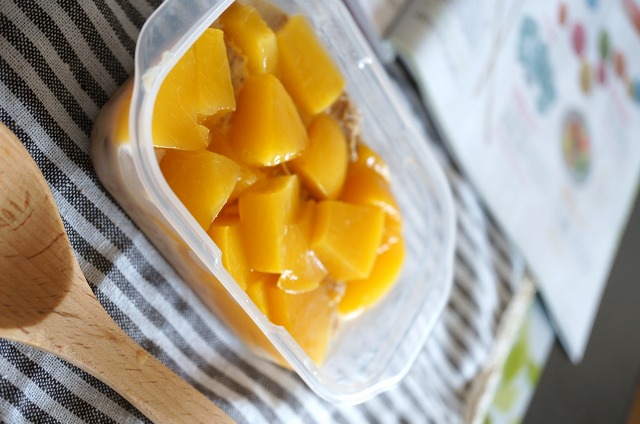 ちょっと牛乳を少なめにして、余った黄桃を乗っけてみました。