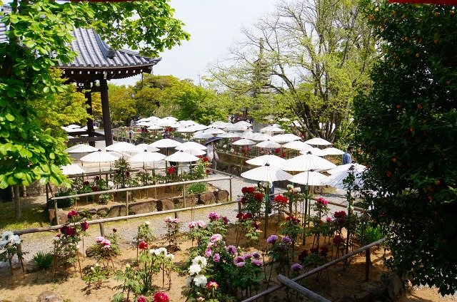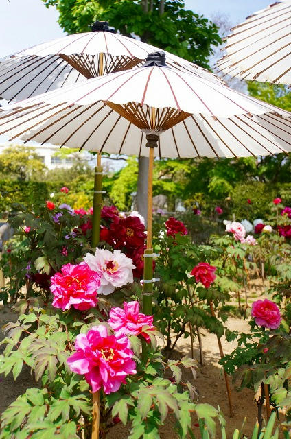 牡丹を日差しから守るためにたくさんの傘が立てられています。