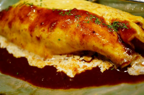 ふわっふわの玉子の中に、スパイシーな豚肉とシャキシャキもやしが入ってます。