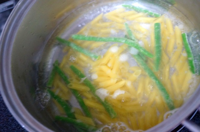 ①お湯を沸かし、ペンネと冷凍インゲンを3分茹でる。