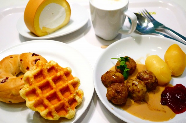 私はミートボール(5個/349円)とベーグル(130円)、ワッフル(120円)、スフレロール(249円)、ドリンクバー(150円)を頂きました。