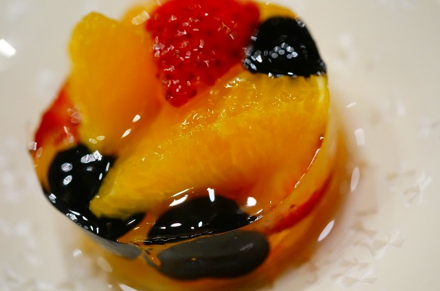 途中アイスが出てきたのでデザートはないと思ってたんですが、オレンジとイチゴと黒豆のゼリーが出てきました。