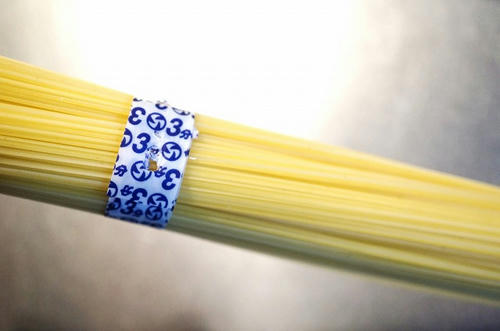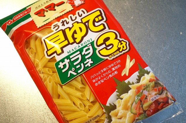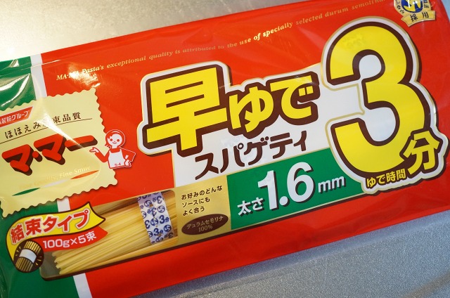 つかうパスタ麺はこちら。早ゆで3分太さ1.6mm。