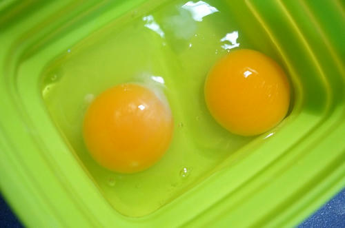 ④パスタが茹であがったら、シリコンケースに入れた玉子を600ワットで40~50秒温める