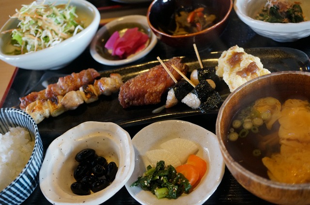 焼き鳥、手羽揚げ、とり天、小鉢やサラダなど盛りだくさんの内容でした。