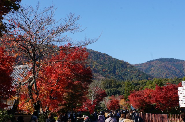ここには天龍寺の塔頭(たっちゅう)である小院が並んでいるのですが、そこのお庭にあるモミジが外からちらっと見えるんです。