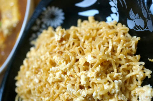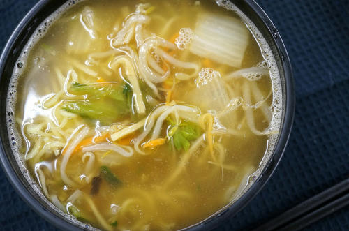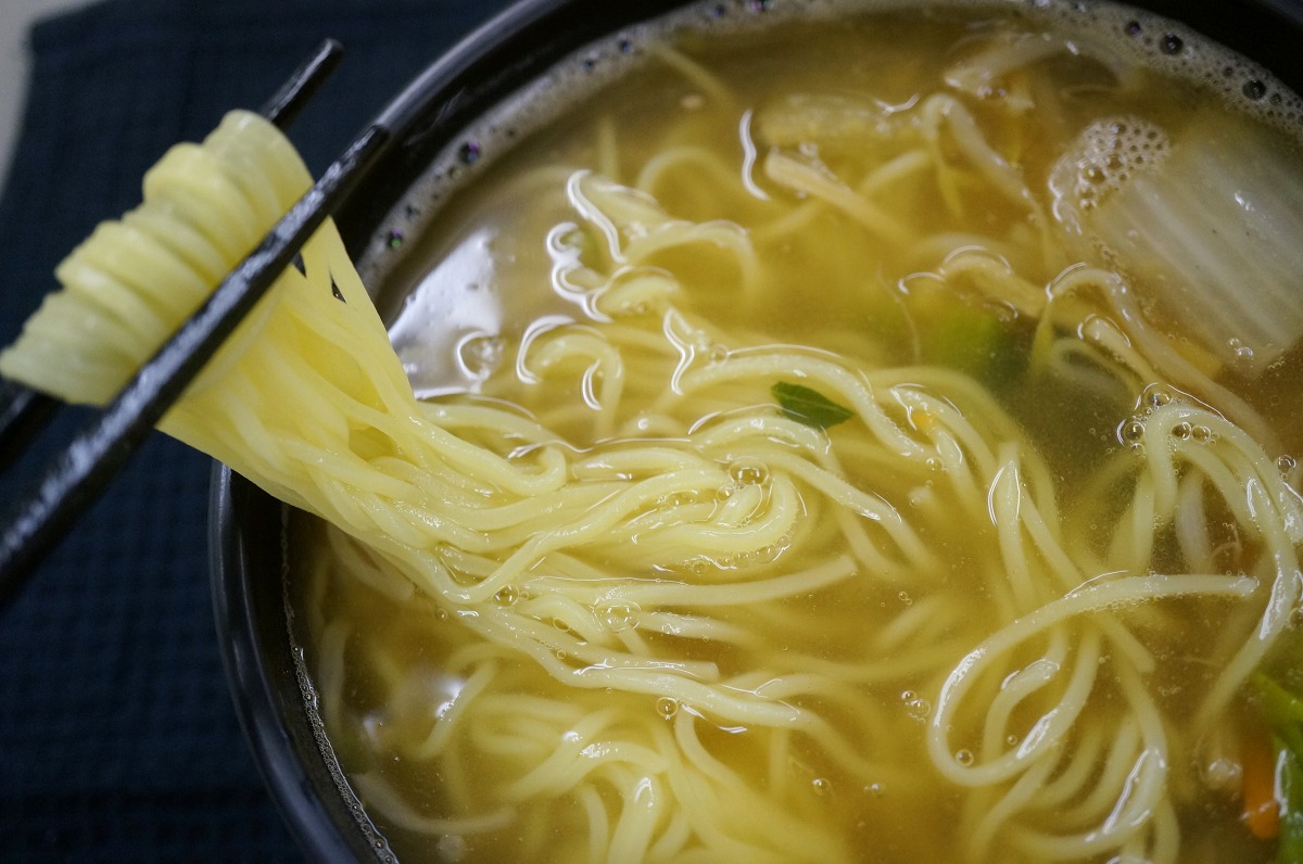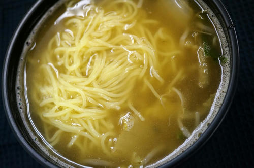 先ほど温めた具材入りスープを熱湯270ccと混ぜ、そのあとにチンした麺を入れます。