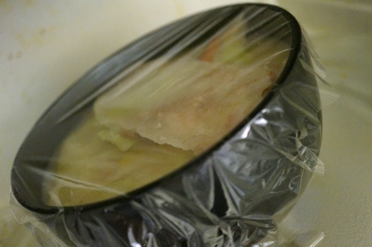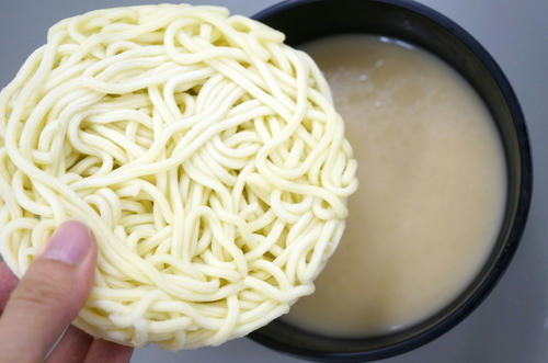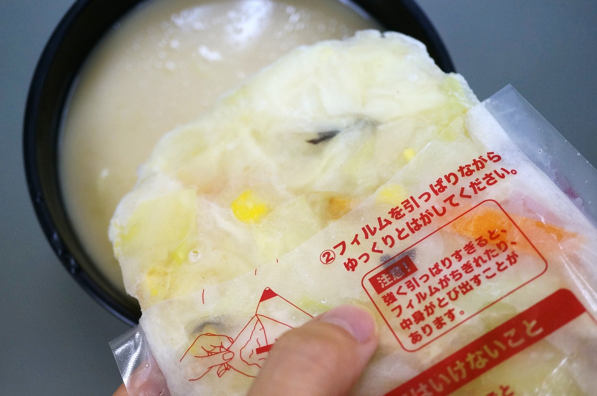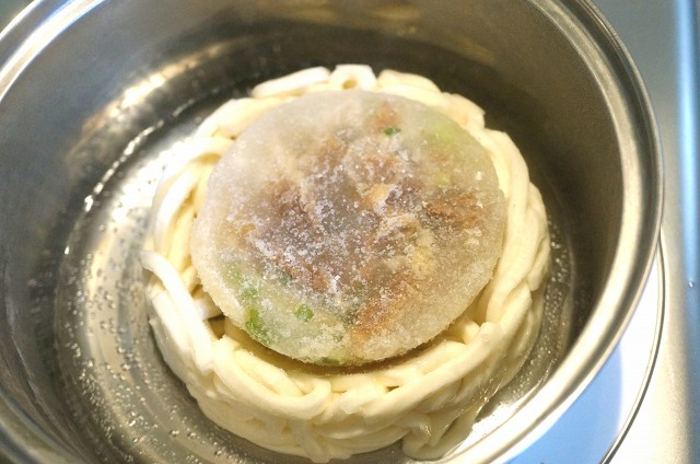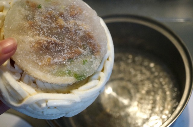 お椀に入れた熱湯にスープの素を溶かして、さらに凍った麺を入れます。