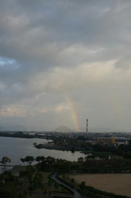 長浜は夕焼けが綺麗に見れる場所ですが、時間と天気に恵まれなくて残念に思っていたんですが、翌朝まどから大きな虹がかかっているのが見えました!