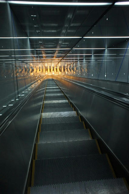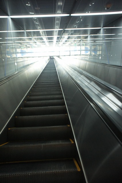 21:00すぎだったので、上るお客さんはあまりいなくて、長い長い上りエスカレータには人の気配もなく…。