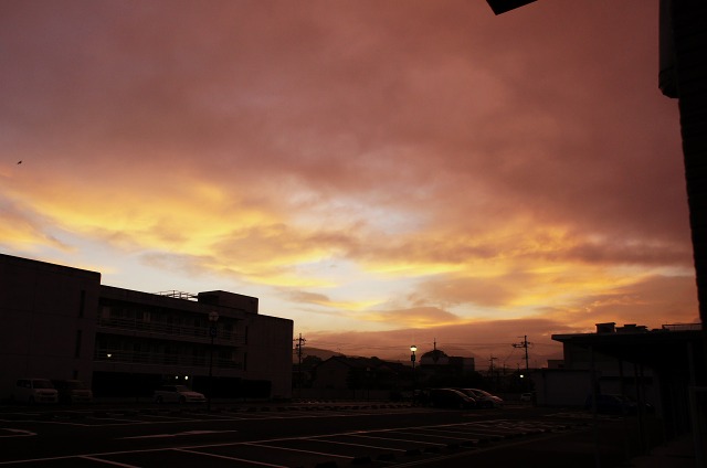 技術担当者に電話を変わって状況を説明し、「調べますので、また折り返しお電話します」の返事待ちで寝るに寝れず、ふと外に出てみると美しい↑朝焼けに遭遇したというわけです。