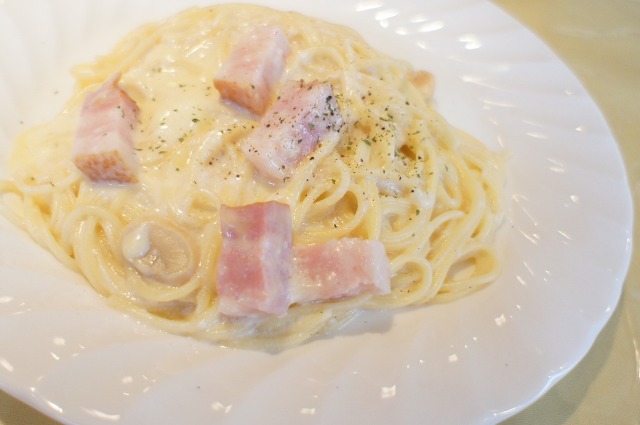 今回は、厚切りベーコンとモッツァレラチーズのクリームパスタ(880円)。