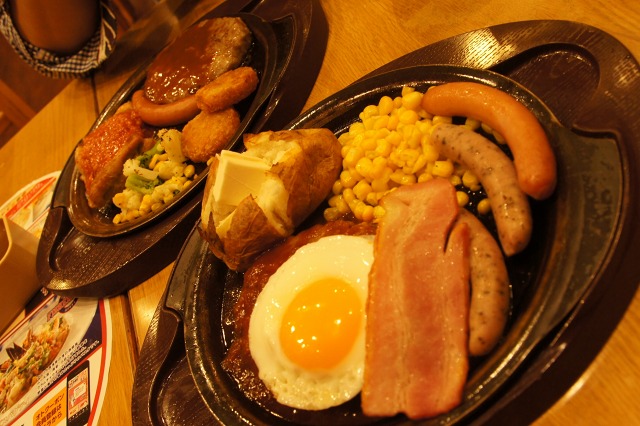 ホテルに帰ってのんびりしていたのですが、そういえば昼間のメロンパン以降、何も食べてなかったので、深夜のガストでテキサスバーベキューハンバーグ&バジルソーセージ(733円)を食べてきました。