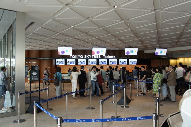 このチケットカウンターでは、天望デッキのチケット(2000円)だけ買うことができ、もう100m高い天望回廊のチケット(+1000円)は天望デッキにて並んで買うことになります。