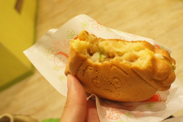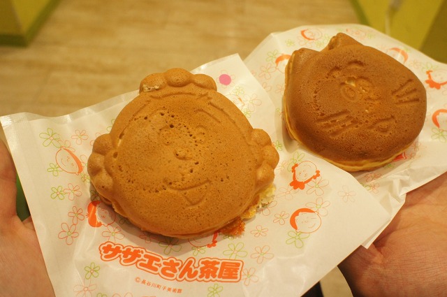 ここはTVのキャラクターのグッズとか売ってるんですが、そのなかでサザエさん茶屋というのがあったので、サザエさん焼 もんじゃ味チーズ入り、タマ焼 イチゴミルククリーム味(各200円)を頂きました。