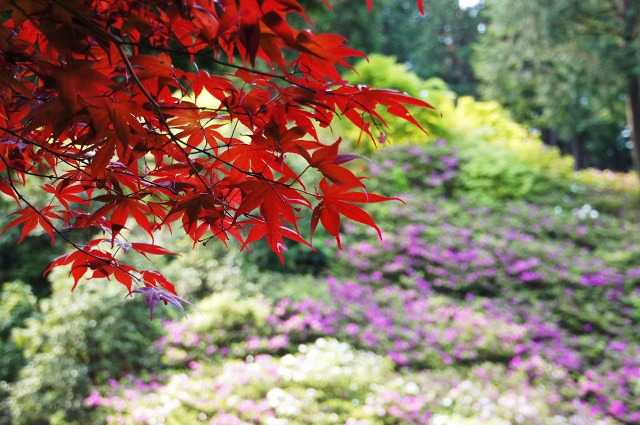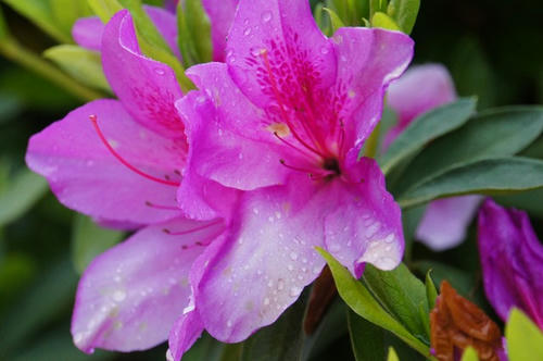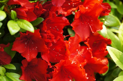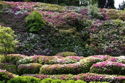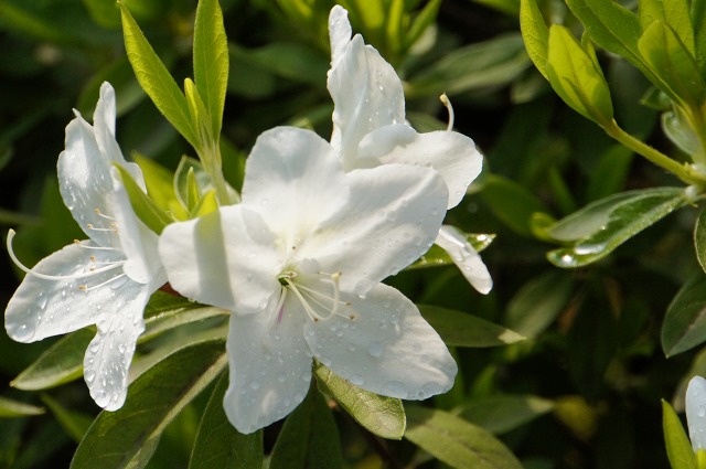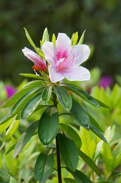丁寧に水やりされていて、水しぶきを浴びた艶っぽいツツジを見ることができます。