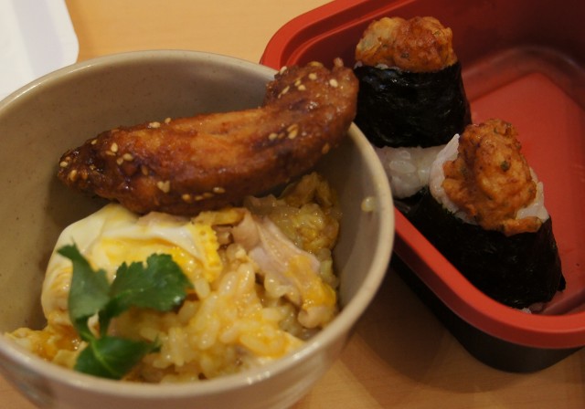 地雷也の天むすと、鶏三和の名古屋コーチン親子丼と手羽からを買ってそれぞれシェアして食べました。