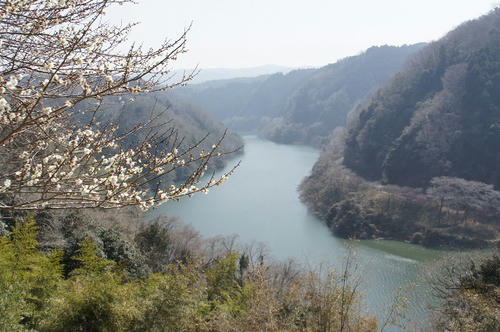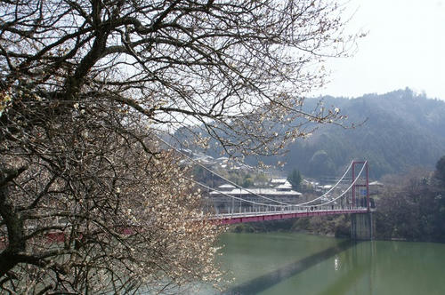 もうちょっと咲いていれば、梅の花ごしに見える吊り橋がもっと絵になったでしょうに…。