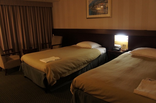 お部屋はツイン。落ち着いた雰囲気ですね。