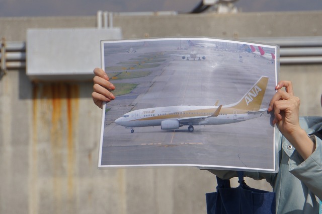 飛行機を誘導する進入灯の近くで、離発着する飛行機を待つ間、珍しいANAの機体の写真を見せてもらいました。