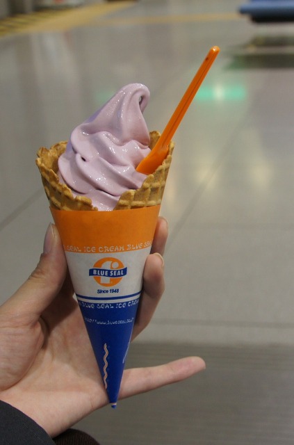 アイスの種類はいろいろあるんですが、今回は大好きな紅芋のソフトクリームを頂きました。