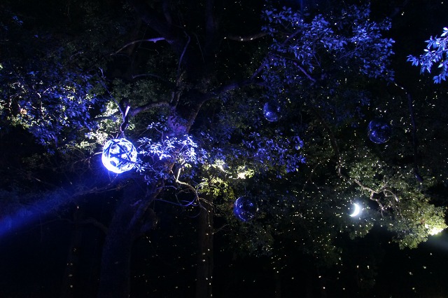 ミラーボールから放たれる小さな光のつぶは、地面や木々や、人々に映されてとても神秘的。