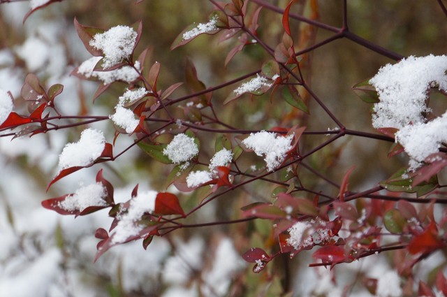 昨晩から降り続いている雪のおかげで、庭木がとっても寒そうです。
