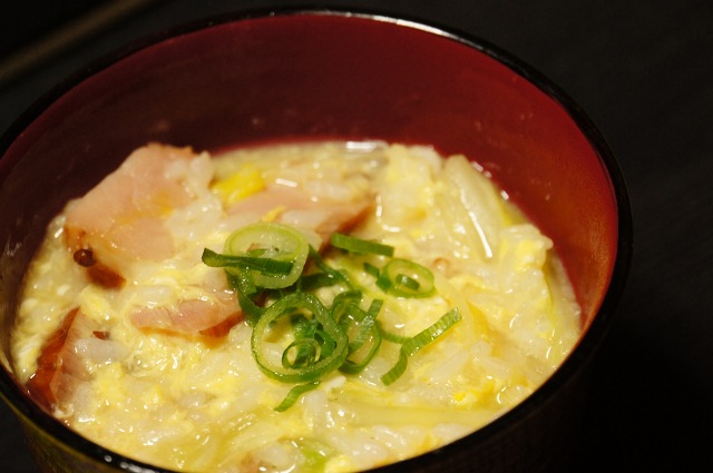 だし汁で白菜と冷ご飯と残り物の焼豚を煮込んで、めんつゆで味付けしただけの雑炊ですが