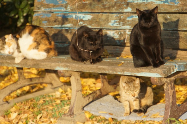 写真、ちょっとブレてますが、ベンチが猫さんで占領されてます。