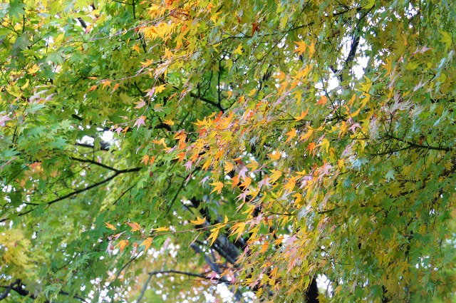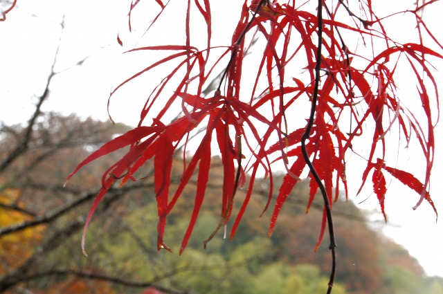 赤々として散りかけている紅葉も多いなか、まだ染まりかけのものもありましたよ。