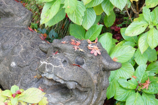 あら。狛犬さんの頭にも紅葉のっかってますね。