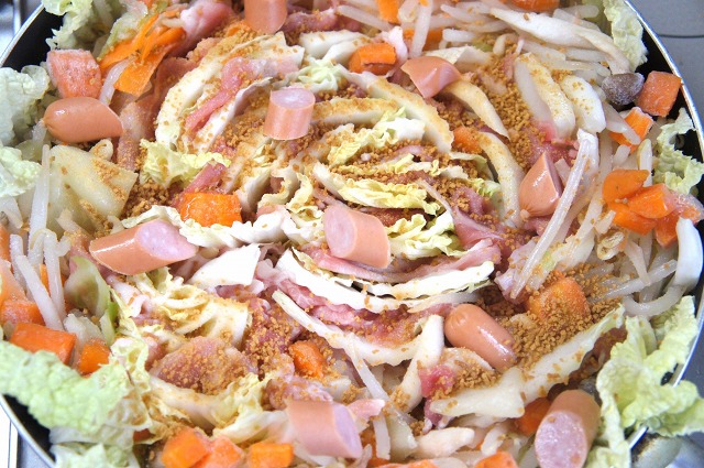 白菜を立てるように並べて間に豚肉つめて、他にもニンジンとかモヤシとか残り野菜を詰め込んで、焦げ付き防止の水100mlとコンソメ大さじ2をふりかけて火にかけるだけ。