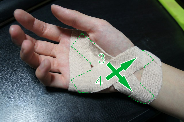 そしてクロスするように3と4の位置にテーピングします。両端は1と2のテープの上に重なるように貼りましょう。