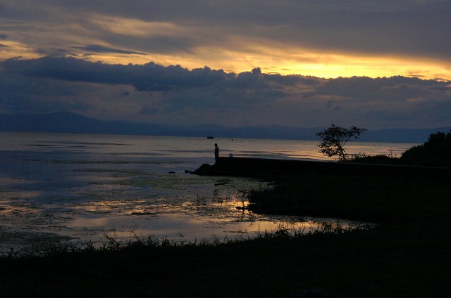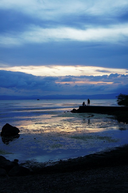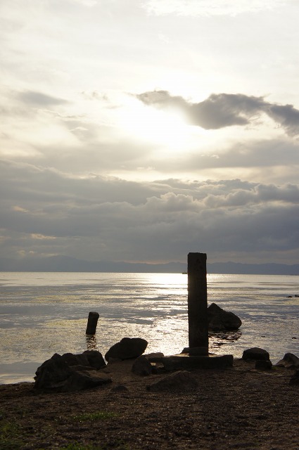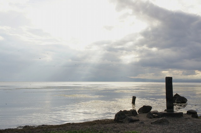 明るいうちに浜にいって琵琶湖を見渡してみると、雲の隙間から光のカーテンが見えました!