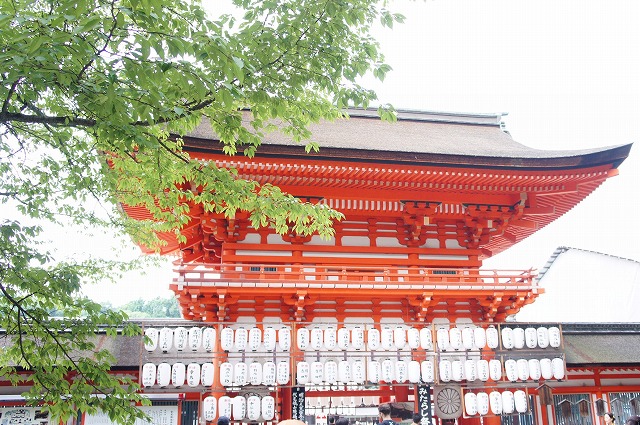 進んでいくと、木々の緑に映える朱色の楼門が見えてきました。
