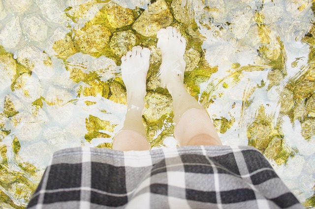 膝上までレギンスをあげて、裸足になって御手洗池に向かいます。