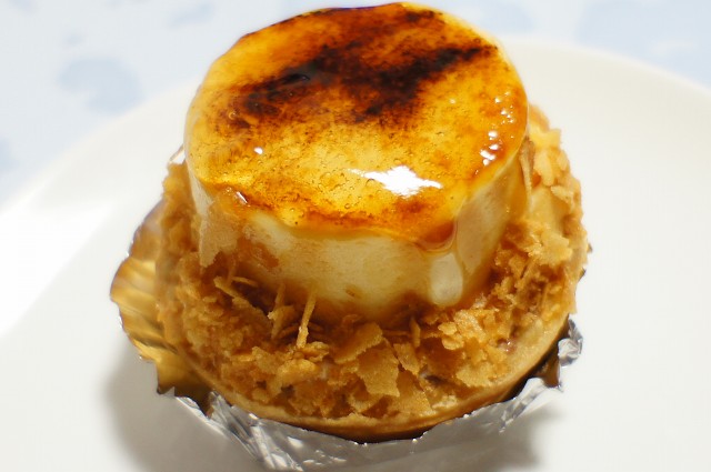 クッキー生地の器の中にカスタード系?のクリームと甘いリンゴ、そしててっぺんにカラメルがかかってます。