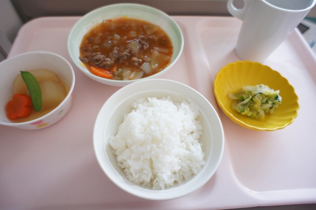 最初も思ったんですが、病院食っておかずに比べてご飯の量多いです。