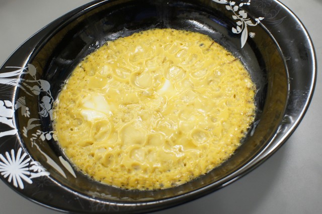 出汁がいっぱい入った、残り卵汁にお湯を少し足して1分半レンジにかけると、これまた即席茶碗蒸しの完成ー。