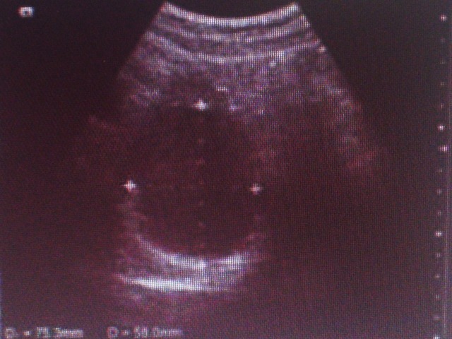 のう胞がでっかいですね~。この画像だと最大横径は7cmぐらい。